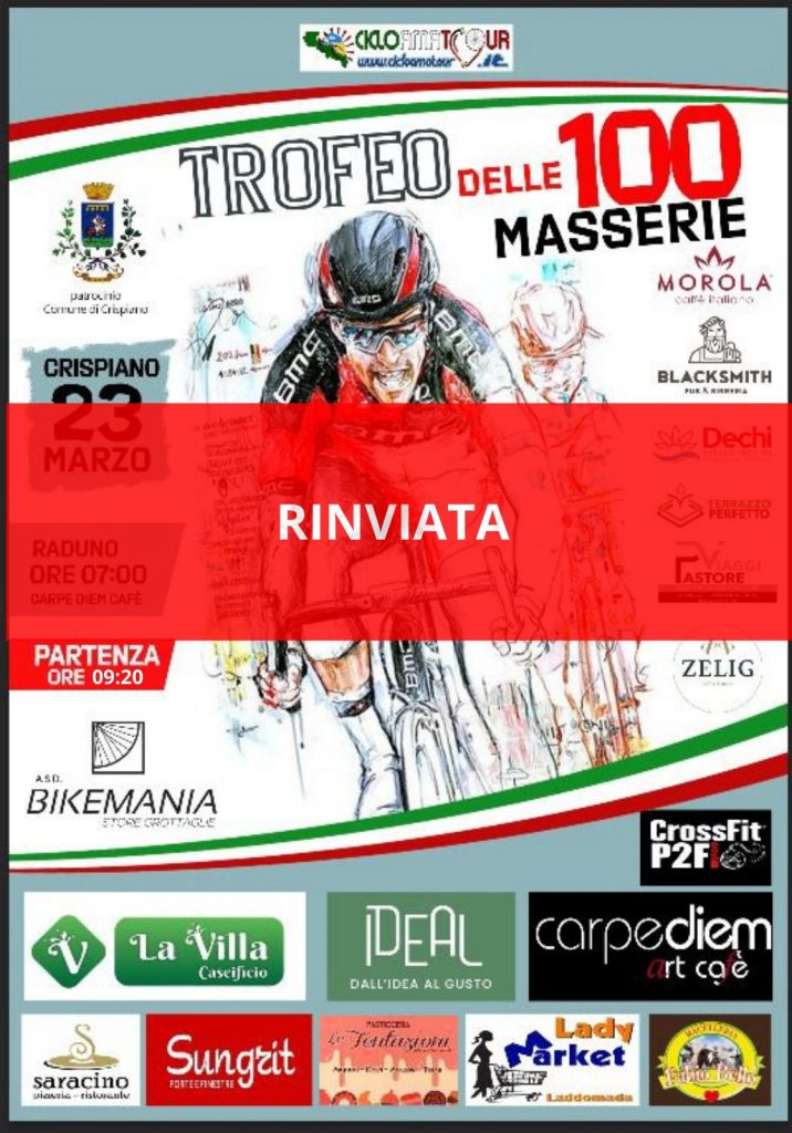 A seguito del bollettino meteo ufficiale emesso dalla Regione Puglia in data odierna e pervenuto per tramite degli organi di Protezione Civile e Forze dell’Ordine tutte alle ore 08:25, in comune intesa con la società organizzatrice ASD BIKEMANIA, la Direzione di Corsa ed il corpo Giuria, è stato deciso l’annullamento della manifestazione.